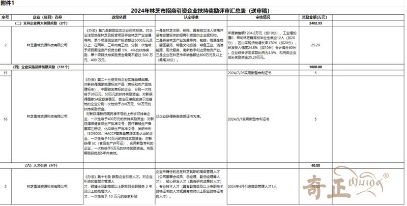 根據(jù)《林芝市推進(jìn)改革開放促進(jìn)招商引資試行辦法》(林政發(fā)[2022]69號(hào))相關(guān)規(guī)定,經(jīng)林芝市招商引資企業(yè)扶持獎(jiǎng)勵(lì)資金評(píng)審小組及林芝市發(fā)展和改革委員會(huì)黨組研究同意,林芝雪域資源科技有限公司共獲批2024年度招商引資企業(yè)扶持獎(jiǎng)勵(lì)資金45.29萬元,其中包括:一是根據(jù)公司2023-2024年期間銷售額、工業(yè)增加值、區(qū)內(nèi)采購(gòu)指數(shù)、帶動(dòng)就業(yè)以及研發(fā)投入強(qiáng)度等情況,給予一定企業(yè)成長(zhǎng)扶持獎(jiǎng)勵(lì)資金,用于支持研發(fā)創(chuàng)新和擴(kuò)大再生產(chǎn)的企業(yè)做大做強(qiáng)獎(jiǎng)勵(lì)25.29萬,二是對(duì)公司引進(jìn)的博士學(xué)歷且全職服務(wù) 2 年及以上的高層次人才,一次性給予的安家補(bǔ)貼10萬元,三是對(duì)公司2023-2024年期間新申報(bào)的發(fā)明專利給予一次性扶持獎(jiǎng)勵(lì)資金10萬元。